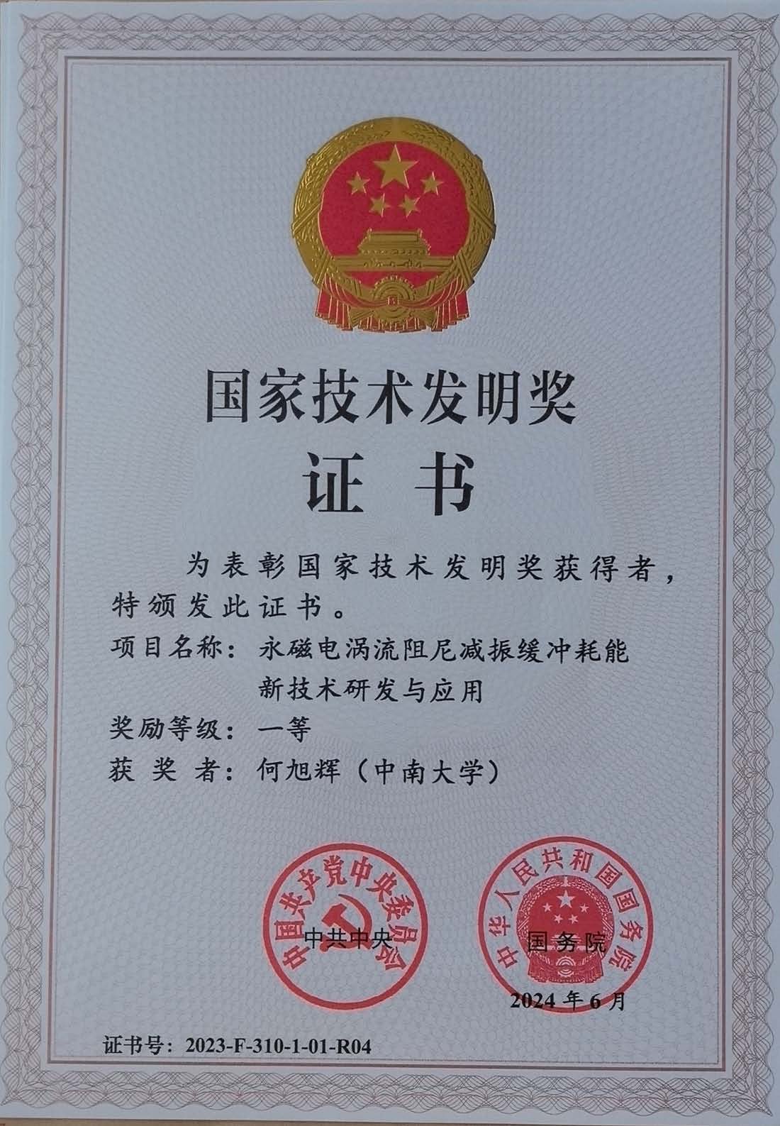 我院何旭辉教授参与完成的“永磁电涡流阻尼减振缓冲耗能新技术研发与应用”项目荣获2023年度国家技术发明奖一等奖。