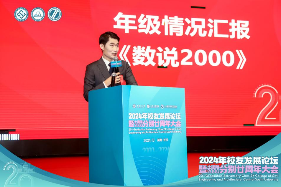 2000级土木工程专业学生周涛代表本次大会筹备组进行了《数说2000》的汇报,从事业发展、家庭建设、成长收获等方面,对20年来2000级校友发展状况进行分析和总结,并表达了校友对母校的美好祝福。