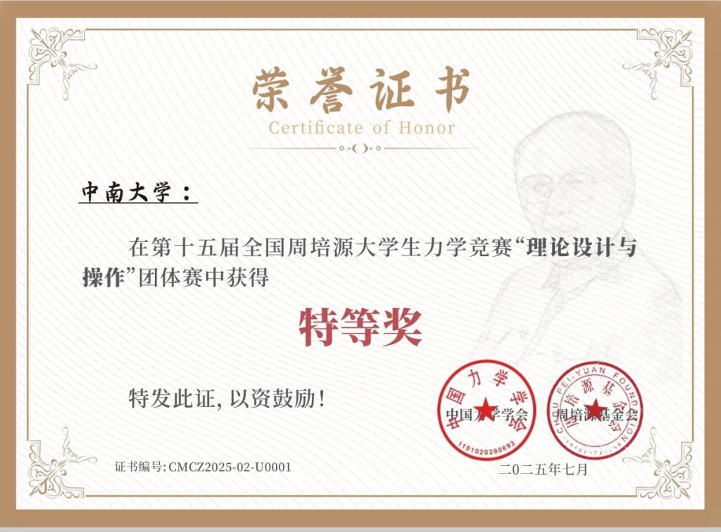 7月17日,第十五届全国周培源大学生力学竞赛“理论设计与操作”团体赛在国防科技大学圆满落幕。经过激烈角逐,中南大学代表队以总分第一名勇夺本届比赛唯一一项特等奖,创造了中南大学在该项赛事中的历史性突破!同时,在“基础力学实验”和新增设的“空间轨道设计”两项团体赛中均获得优秀奖,王宁波、肖厦子、任予涵三位老师获得优秀指导教师奖,展现了中南大学在力学学科的卓越教学水平和人才培养成果。