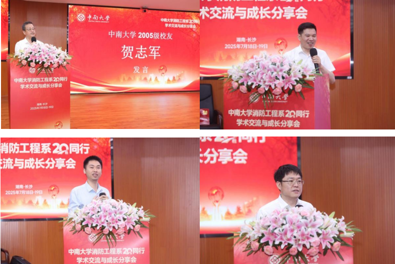 随后,校友代表发言交流。2005级校友、中南大学交通运输工程学院原党委书记贺志军,深情感谢徐志胜教授、赵望达教授等老一辈教师的付出,并引用“星星之火,可以燎原”“众人拾柴火焰高”表达对恩师们点燃学子求知之火、奠定事业根基的崇高敬意;2006级校友、消防工程系首位本硕博毕业生、2025年共青团中央新时代青年先锋奖获得者、中国安全生产科学研究院李建分享了个人科研及工作经历,重点介绍地铁火灾蔓延理论、控制技术及检测方法研究情况,坦言母校所学知识对工作助益颇深,并深情感谢了母校和恩师;2004级校友、福州大学张冬副教授分享了个人成长经历及在福州大学的工作情况,勉励在校学子珍惜时光、精进专业、投身实践,为未来发展夯实基础;2003级校友、中联科锐消防有限公司总经理倪天晓介绍了公司情况,高度赞扬了中南大学浓厚的创业氛围,并分享了自己创业历程;2010级校友、中建八局浙江建设有限公司第三分公司总经理徐骏峰通过线上方式介绍了中建八局发展历程与现状,并向校友们致以诚挚祝福。