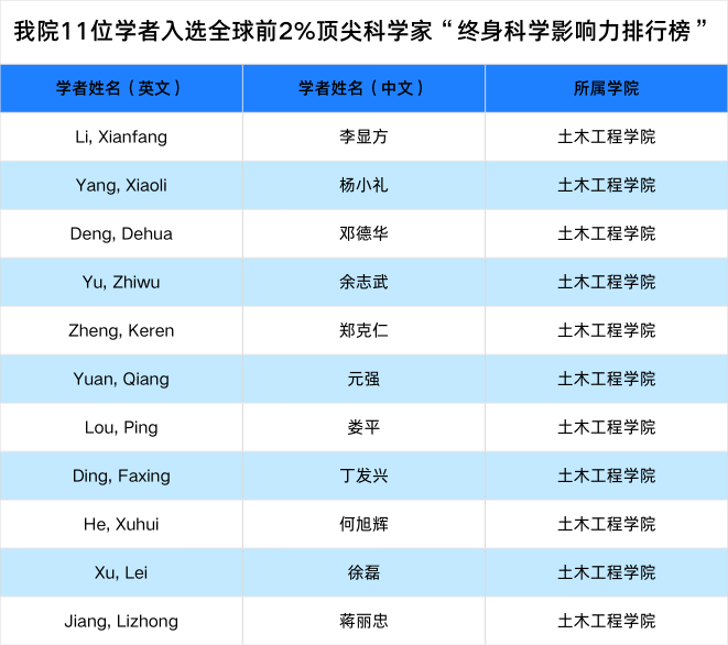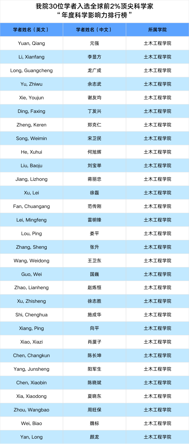 此次多位教师入选全球顶尖科学家榜单,是对我院科研水平与师资队伍建设成果的高度认可,也体现了我院在土木工程及相关交叉学科领域的深厚积累与持续影响力。未来,我院将继续秉承“知行合一、经世致用”的校训,依托雄厚的师资力量与跨学科平台,聚焦国家重大战略需求,加强前沿技术攻关与高层次人才培养,为推进科技自立自强贡献更多智慧与力量。