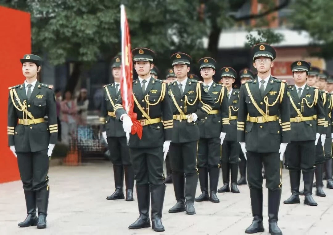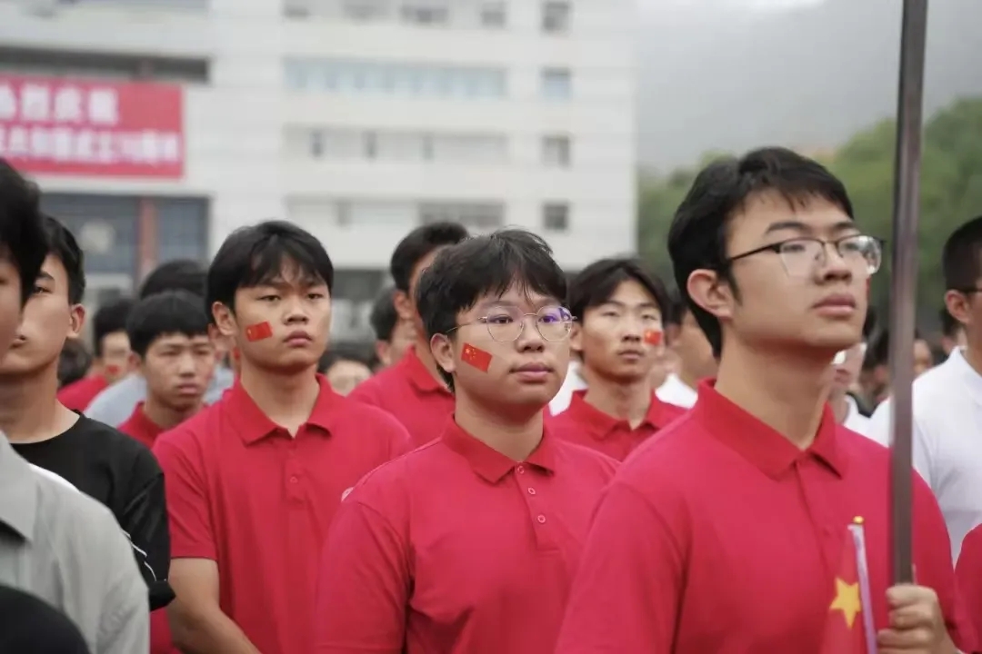 秋风送爽,旭日初升,清晨7:00,升旗仪式正式开始。国旗班仪仗队的同学戎装肃立,金色绶带流转微芒,身形挺拔如铸,迈着整齐铿锵的正步行至旗杆前。随着《义勇军进行曲》庄严奏响,旗手振臂之间,五星红旗如燃烧的火焰,飘扬在晨风之中,全体师生行注目礼,齐唱国歌。