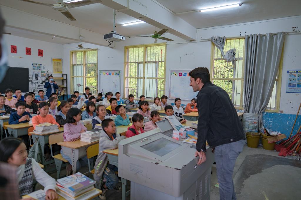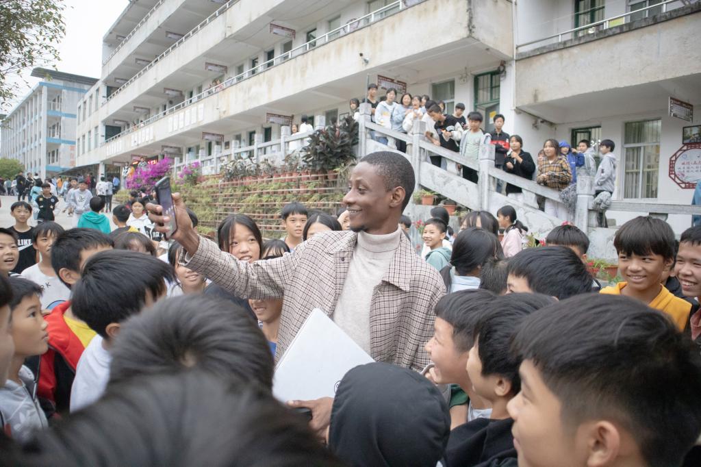 台下,孩子们听得津津有味,时不时举手提问,眼睛里充满了对广阔世界的憧憬和期待;下课后,孩子们叽叽喳喳地欢笑着、跳跃着,围在留学生的身边,争着和“老外”哥哥握手、要签名;临别时,孩子们与留学生难分难舍,送了一程又一程。这一刻,考察团成了山村孩子们通向世界的一扇窗。