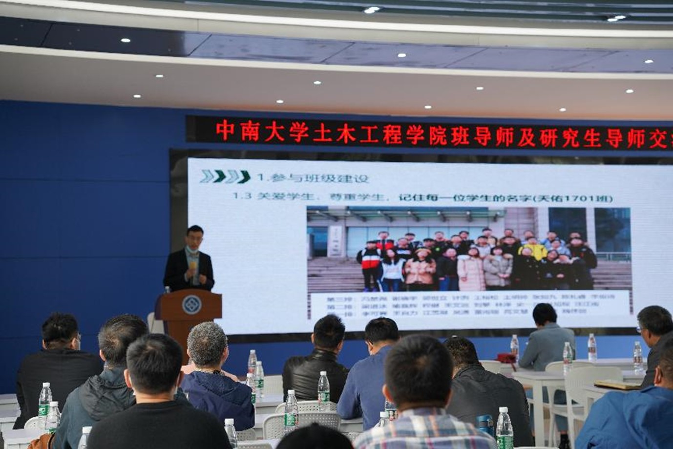 会议伊始,原天佑1701班、现天佑2001班导师严磊老师结合其任班导师期间取得的工作成果分享了其班导师工作经验。他指出,作为本科生班导师与研究生导师有着很大的不同,面临的群体不同、诉求不同、培养目标和发展要求也不同,作为班导师既要照顾集体,又要兼容学生个性成长,建议各位班导师可以把对学生的专业引领和思想价值引领融入班级日常管理教育重,切实关爱每一位学生成长,增强班级集体荣誉感、责任感与凝聚力。