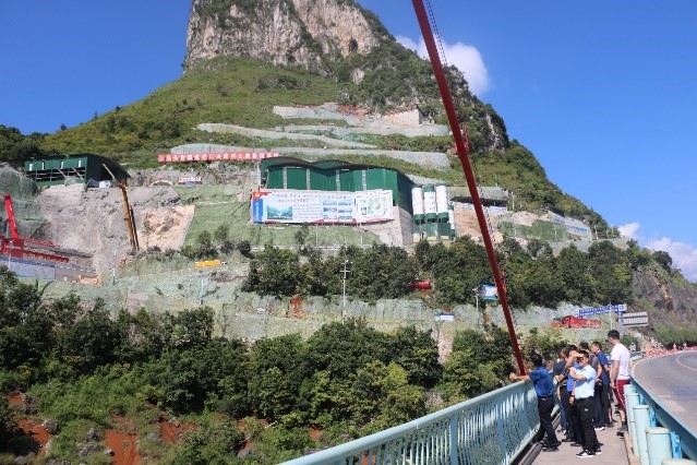 8月13日上午,青年教师实践队到达乌蒙山特大桥,在纳晴高速T12合同段项目经理刘明俊、T13合同段项目经理陈磊的陪同下,考察了世界首座钢桁-混凝土组合拱桥——乌蒙山特大桥,该项目的缆索吊装模块施工系统,对环境影响小,工区用地小的特点。现场参观的青年教与现场技术专家就如何推广项目在施工组织和工程施工方面的创新以及拱桥在施工期间的主要工程重难点问题进行了深入研讨。