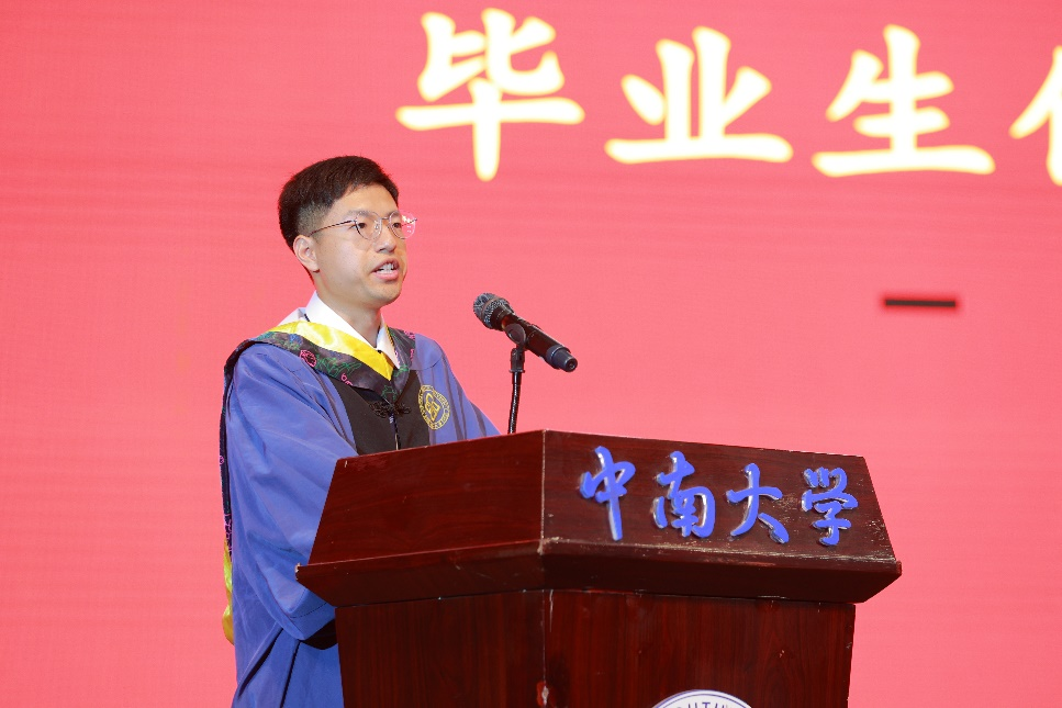 本科毕业生代表徐炳隆同学发表了毕业感言。他首先感恩了中南大学和国产又黄又猛又粗又爽,感谢了师长们和亲友们对我们的教导与陪伴,随后他回顾了在中南与师友们相处的点点滴滴。最后他对即将踏上的人生新征程表达了畅想和展望,希望和大家一起面对现实、忠于理想、放下心结、坦荡生活,努力奋斗,贡献青春力量。