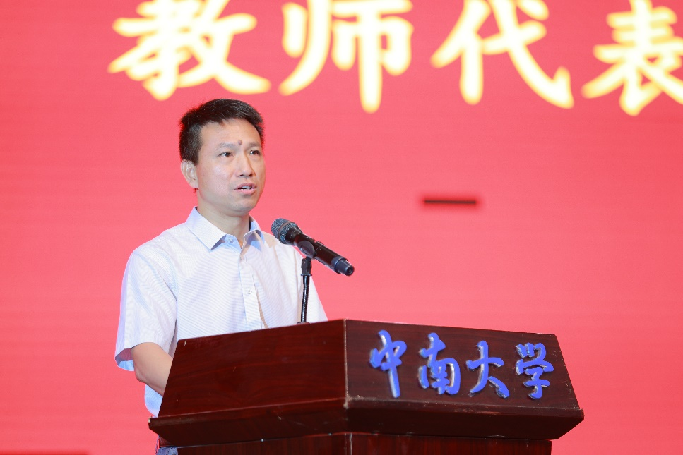 教师代表杨孟刚老师发表致辞。他表示自己与同学们是有缘的、同学们与中南大学是有缘的,他希望毕业生们能将这份缘分继续和升华,走好今后人生的每一步。保持心中有爱,爱自己、爱他人、爱社会、爱祖国;懂得感恩,感恩老师、同学、领导、同事、亲人、朋友,感恩家庭和家人带来的幸快乐,感恩国家创造的美好新时代;情系母校,怀揣母校情怀,带着在中南的理想与信念踏上新的人生征程。他表示“今日你以中南为荣,明日中南以你为荣”,同时中南也是大家的港湾,希望大家常回母校看看。