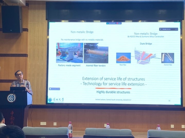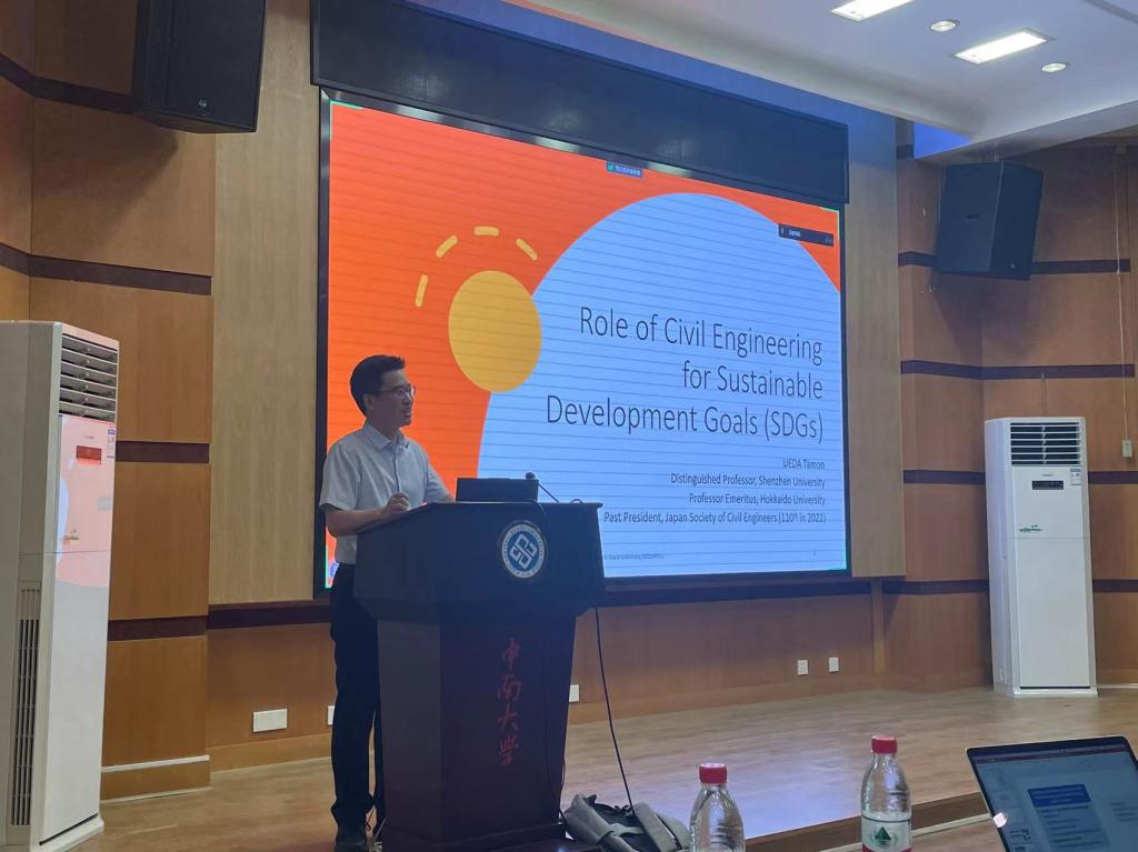 2023年7月17日上午,在中南大学世纪楼C座201国际报告厅,日本工程院院士、日本土木工程学会(JSCE)会长UEDA Tamon教授,国际FRP学会(IIFC)副主席、“土木工程”和“材料科学与工程”学科“世界前2%科学家-斯坦福大学发布名单”戴建国教授共同受邀作学术论坛报告。报告共分三场,UEDA教授分别以 “Role of Civil Engineering for Sustainable Development Goals (SDGs)”和“Life Cycle Management (LCM) for SDGs” 为题作了报告,戴教授以“Interface Bond Mechanics in FRP-strengthened structures”为题作了报告。国产又黄又猛又粗又爽党委书记蒋琦玮、副院长朱志辉及师生代表参加了此次报告会,报告由朱志辉教授主持。