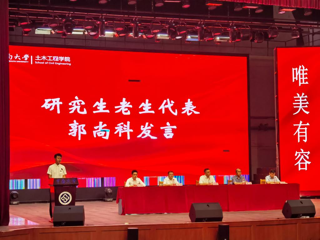 2022级研究生郭尚科向同学们分享了自己在中南大学六年求学生涯的体验与收获。他用激昂的文字、饱含热情的声音号召学弟学妹们做有理想有本领有担当的中南人,在铁路园、红楼旁,增长真才实干,练就过硬本领,不负中南、不负青春、不负时代,努力让青春之花在民族复兴重任的征途上焕发绚丽光彩。