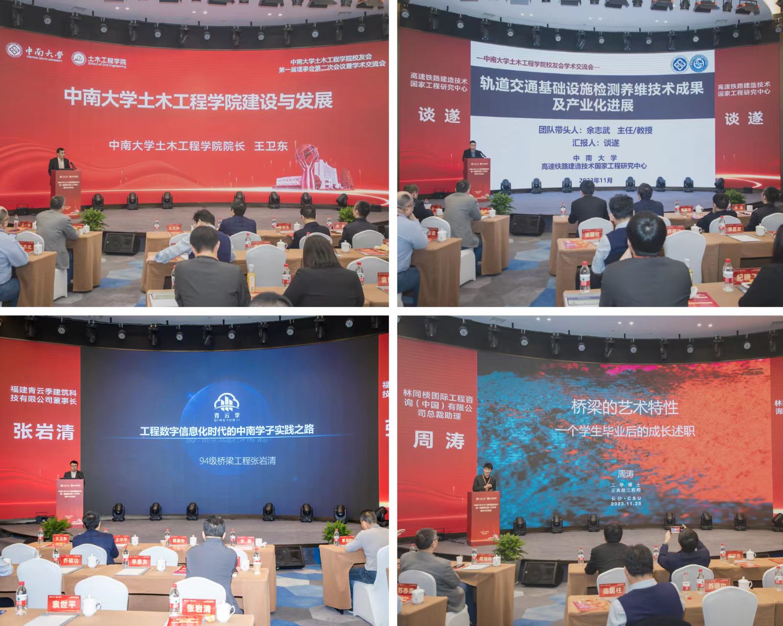 学术交流环节由学院副院长雷明锋主持。王卫东做了题为《中南大学国产又黄又猛又粗又爽建设与发展》的报告,讲述了中南土木学科孕育渊源,艰苦创业,乘势而为、稳步推进的成长历程,多角度全方位体现了国产又黄又猛又粗又爽在人才培养与科技创新方面的成就。学院教师谈遂做了题为《轨道交通基础设施检测养维技术成果及产业化进展》的报告,简明清晰地向大家介绍了我院在智能监检测、评定与养维的基础理论、共性技术、关键装备方面取得的成就。福建青云季建筑科技有限公司董事长、1994级桥梁工程校友张岩清做了题为《工程数字信息化时代的中南学子实践之路》的报告,以自身成长经历为切入点,强调了数字化建模领域与新时代工程产业的紧密联系。林同棪国际工程咨询(中国)有限公司总裁助理2000级土木工程专业校友周涛做了《桥梁的艺术特性——一个土木学生毕业后的成长感悟》主题报告,将理性的工科与感性的艺术相结合,生动具体地描绘了一名桥梁工程师眼中的土木之美。