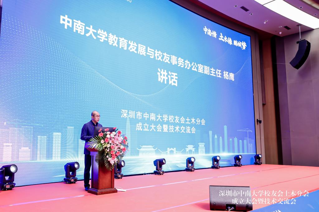中南大学教育发展与校友事务办公室副主任杨鹰代表校友总会对深圳中南大学土木校友分会成立表示祝贺,并希望各地校友会分发挥校友会的平台优势,信息优势,组织优势和人才优势,发挥校友会的桥梁和纽带作用。
