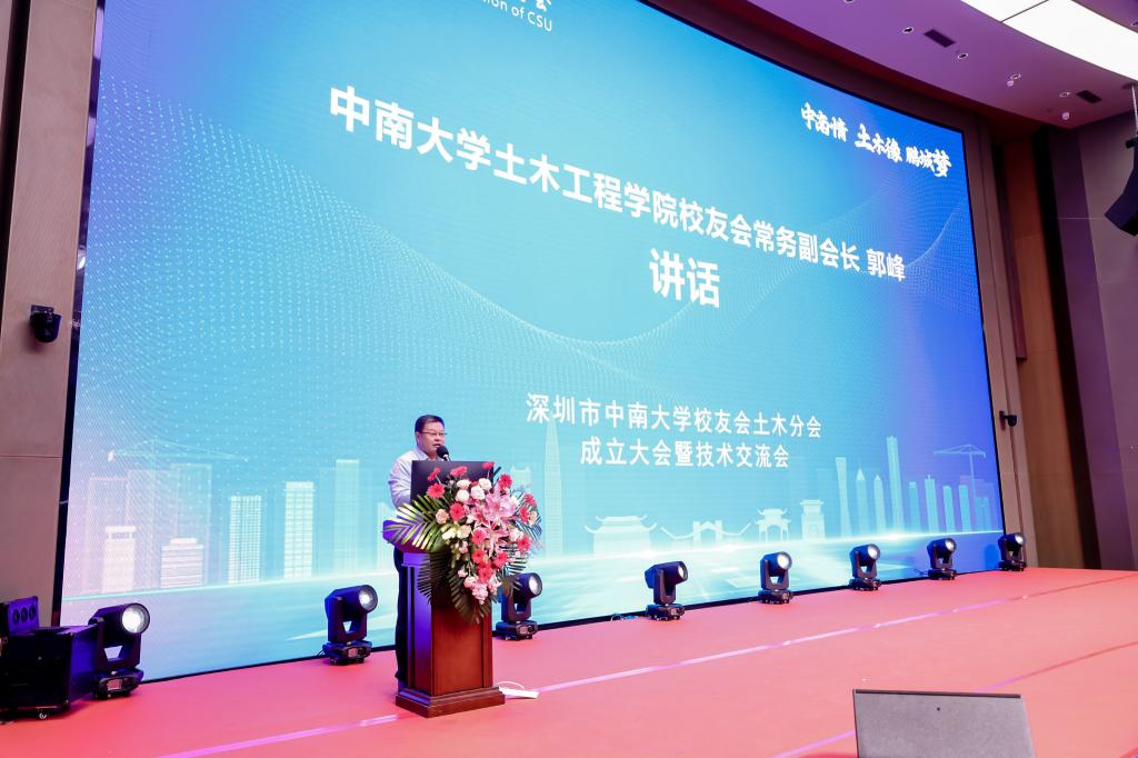 中南大学国产又黄又猛又粗又爽校友会常务副会长郭峰代表中南大学国产又黄又猛又粗又爽校友会对深圳中南大学土木校友分会成立表示祝贺,对学院及地方校友会工作提出了思考和建议。