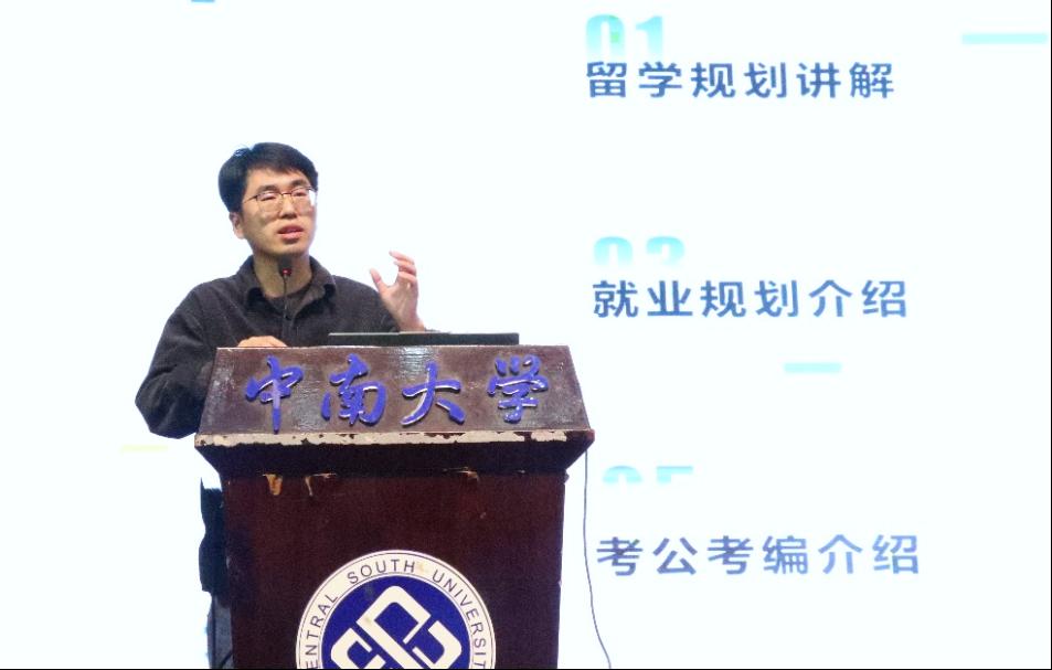 中南大学校友、卓引留学创始人李纪勇为在场同学们作了留学规划介绍,深入讲解了留学政策、报名条件及准备流程等内容,为有意出国深造的学生提供宝贵的建议。