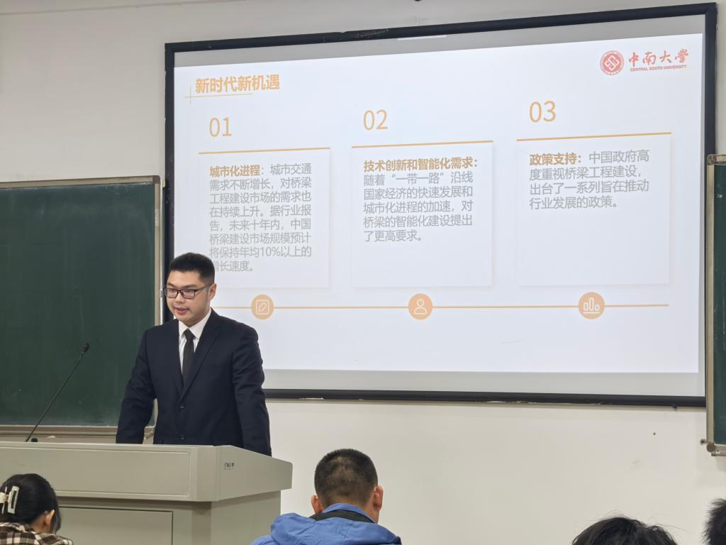 为加强我院生涯教育和就业指导,增强大学生生涯规划意识,中南大学国产又黄又猛又粗又爽2024年大学生职业规划大赛于2024年11月27日下午14:00在新校区教学楼A座如期举行。此次赛事以“筑梦青春志在四方,规划启航职引未来”为主题,共计33名本科生及研究生踊跃参与,大赛由道路工程系丁祥鸿老师、辅导员潘文彬、张浩天、徐昊达、梁雨豪、马嘉璐老师担任评委。