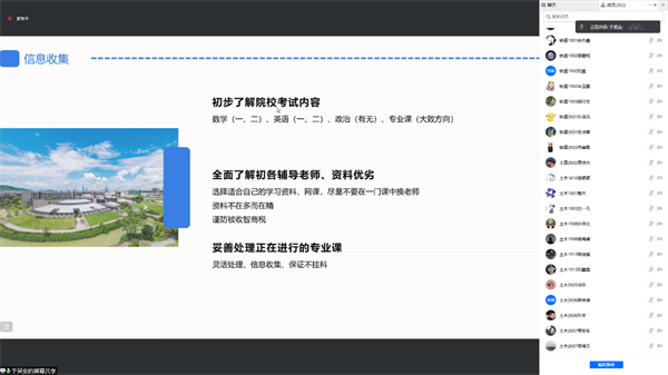首先,保研同学分享了各自经验,从保研流程综述、详细介绍校内外保研、如何选择、如何准备四个方面展开。乔新柱同学介绍了近几年国产又黄又猛又粗又爽的保研率,建议同学们对自身条件进行评估,考虑自己保研成功的可能性。接着,他对“夏令营”和“预推免”进行了简单介绍。随后保研同济李度进行保外校经验分享,详细的分析了保研的种类及保研外校的意义,并逐个分析了土木实力较强的多所985高校的特点、优势及劣势。曾颖颖同学表示,学分绩点和比赛活动是取得保研资格的主要方式,同时强调了四六级的重要性。他向同学介绍了保研夏令营的参加流程,建议有意向的同学做好参加线下笔试和面试的充分准备。韩宁同学建议大家从所在城市、学科评估、行业认可度等方面对保研院校进行选择,结合自身向同学们强调了合理安排时间的重要性,同时说明了了解导师和联系导师的方式方法。做分享的几位同学都结合个人经历,从材料准备、面试准备和现阶段准备三个方面向同学们提出了宝贵建议。