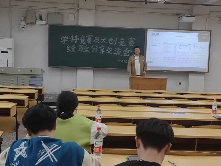 在大二会场,会议伊始,由叶芳达学长介绍竞赛经验。主讲互联网+比赛,学长从个人竞赛经历,竞赛简要介绍和参赛建议以及其他问题和注意事项等几个方面展开。每一方面都有叶学长独到的见解和形象的阐述,同学们听完之后获益匪浅。会议中间休息之余也有小插曲,为了活跃会议的气氛,会议负责人通过抽签的顺序随机两名幸运观众送上特别礼物。接着是王超伟学长针对性的对于结构设计竞赛进行讲解。王学长在结构设计竞赛这方面获奖众多,经验丰富。内容从个人竞赛经历入手,其中包含了比赛现场图片,参赛作品图片和作品加载视频,让听众切身体验到竞赛过程。最后由韩相成学长采用线上讲述的方式为我们介绍学科竞赛方面的问题。其中介绍了各类学科竞赛,分析了各类学科竞赛的权重,表明了韩学长对于不同类竞赛的立场与看法,在思想方面纠正了同学们对学科竞赛的理解偏差。