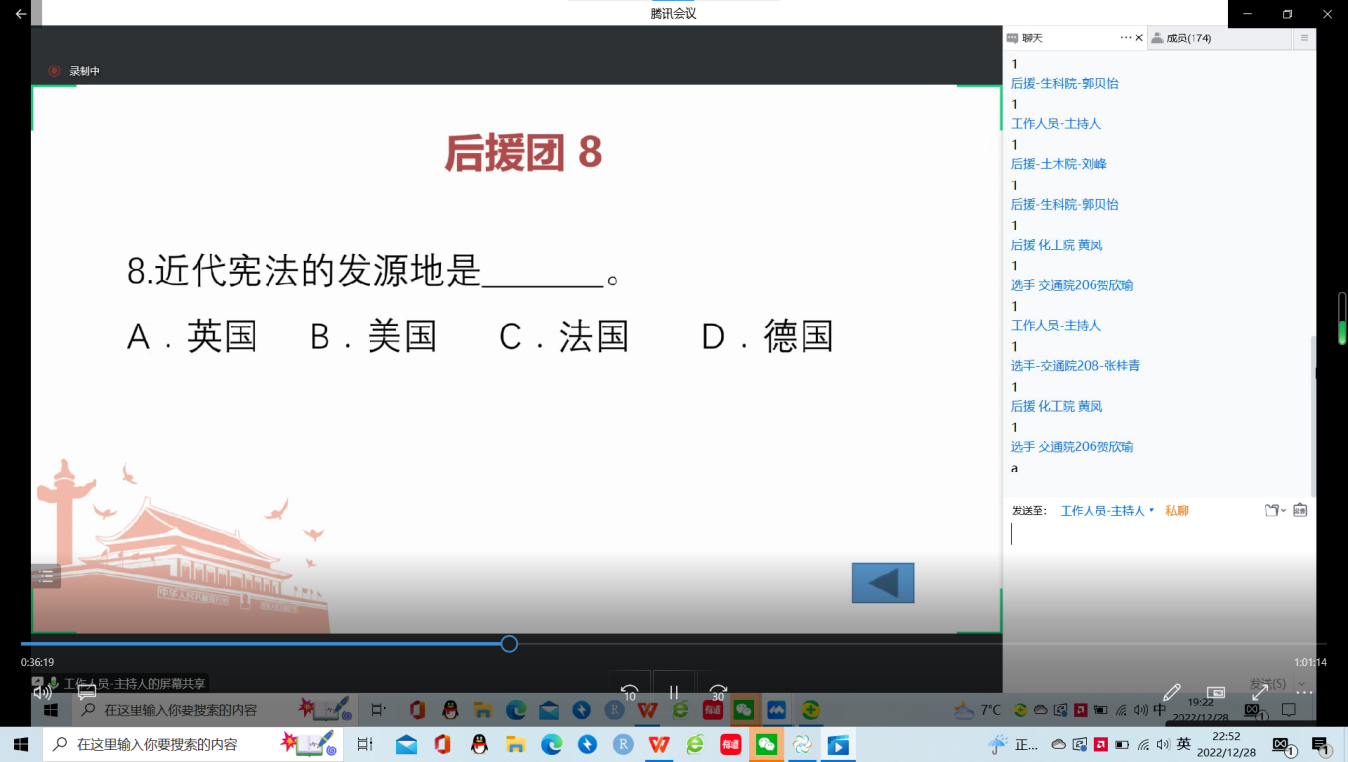 本次理论培训友谊赛以线上方式进行,分为理论学习培训、后援团抢答、参赛选手抢答3个环节。其中,抢答环节的题目由68道选择题和填空题组成,题目知识囊括宪法的发展历程、宪法的地位和作用、宪法的基本原则与主要内容。