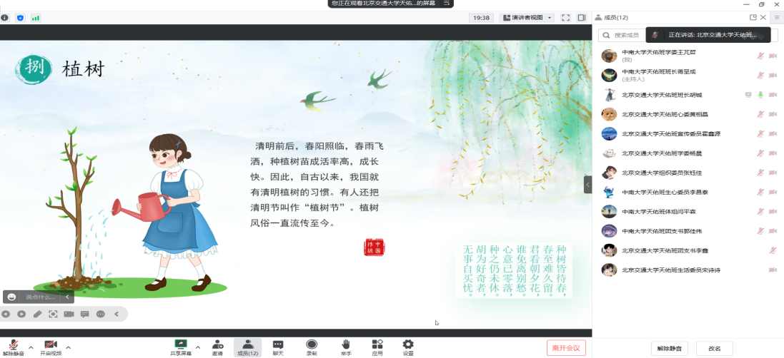 会议第一部分,中南大学蒋呈成同学介绍了清明节的由来,清明节是中国传统节日之一,最开始是庆贺“水患已除,天下太平”的日子,如今发展成为扫墓祭祖,出游踏青的重要节日。北京交通大学胡铖同学介绍了清明节的传统习俗:踏青、扫墓、插柳戴柳、放风筝、荡秋千、拔河、蹴鞠、植树等。