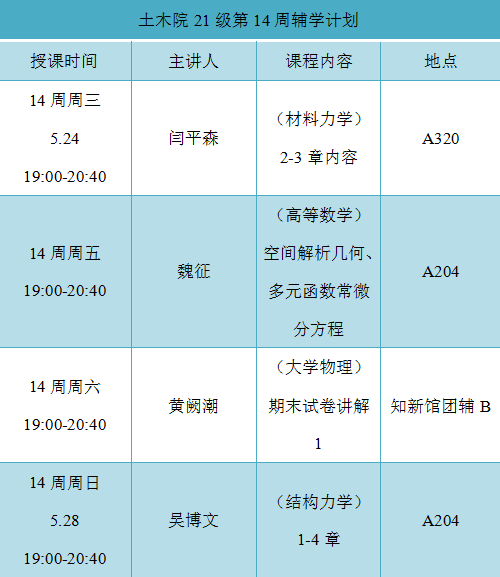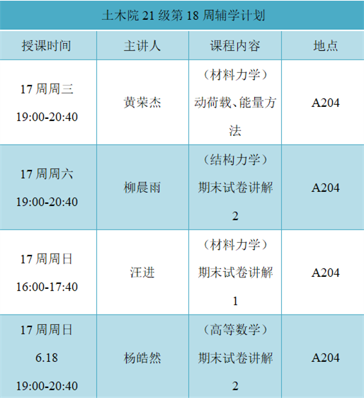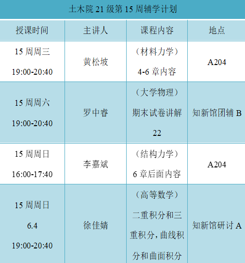 本次辅学活动的15名义工均来自于2021级学习前列、综合素质拔尖学生,针对高等数学、结构力学、材料力学、大学物理历年期末真题、章节框架知识,边归纳总结、边练习检验,通过分析往年科目考试情况以及题型分数分布,以讲解讲透知识点为主,细致演练公式的推导和运用,适当结合书本例题和课后习题,全方位为困难学生解决难题。