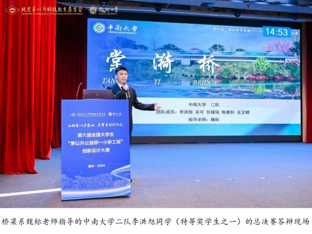 2024年11月29日至12月1日,第六届全国大学生“茅以升公益桥——小桥工程”创新设计大赛决赛在福州大学举行,多位院士、长江、杰青、勘察设计大师等参与现场评审。桥梁工程系魏标老师指导的中南大学二队(李洪旭、任娅铭、全芷晴、陈雅轩、吴可)荣获大赛特等奖,桥梁工程系严磊老师和方淑君老师指导的中南大学一队(赵文琦、殷佳怡、姜浩田、张昕瑶、应家发)荣获大赛二等奖。
