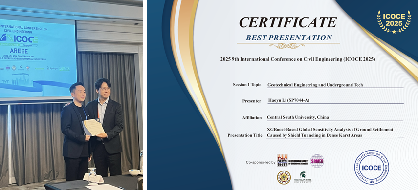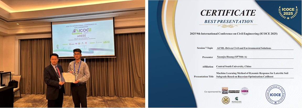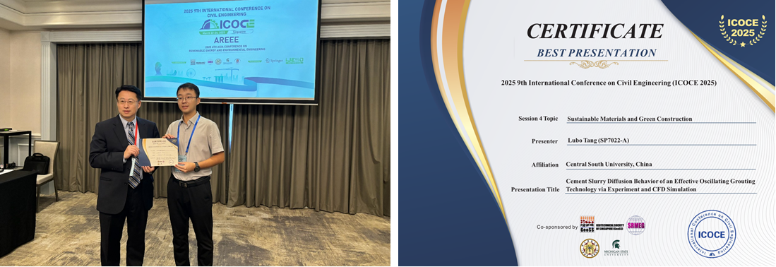 3月22日至24日,第9届国际土木工程会议(9th International Conference on Civil Engineering,ICOCE 2025, Singapore)在新加坡隆重召开,我院岩土工程系博士生唐禄博、李镐羽、鲁立、喻昭晟、周雨婷及高铁中心博士研究生黄轩嘉参会,并作分会场学术报告。其中,唐禄博、李镐羽、黄轩嘉荣获最佳汇报奖。