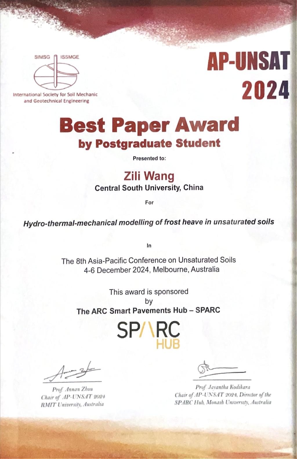 我院岩土工程系博士研究生王自力荣获2024年亚太非饱和土会议最佳论文奖