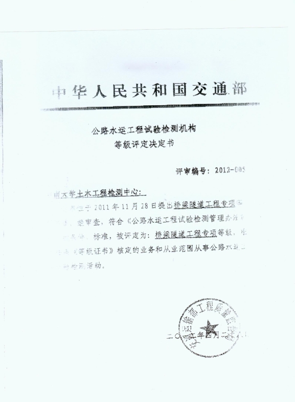 公路水运工程试验检测机构等级评定决定书