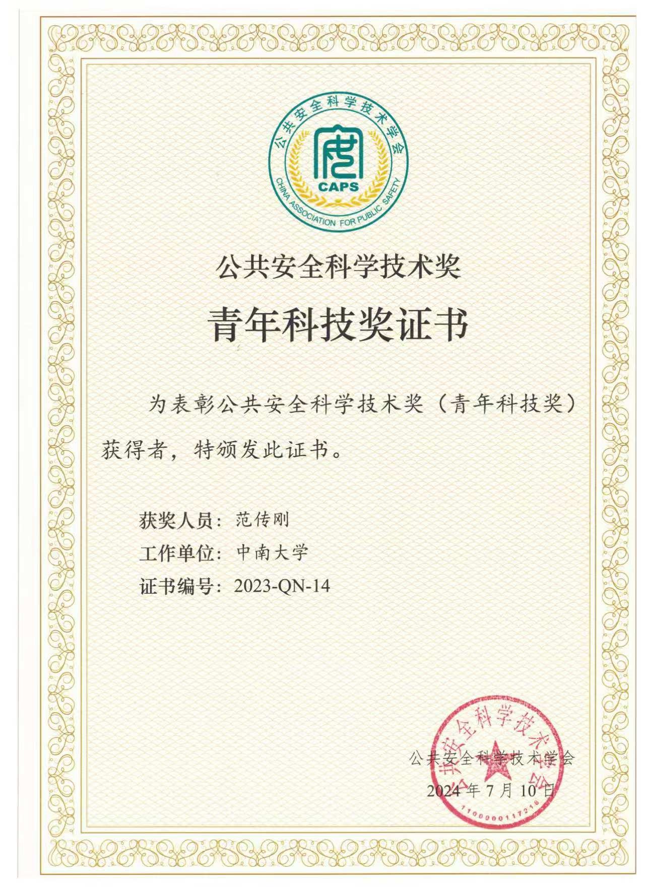 2024年11月15日至18日,中国公共安全大会在合肥成功召开,中国工程院院士范维澄、彭苏萍、苏义脑、袁亮、张来斌、康红普等十余位院士,有关高校、科研院所、协会学会、企业负责人和海内外专家学者等两千余人参加。公共安全科学技术学会主办此次大会,并在大会现场颁发了2023年度公共安全科学技术奖。我院消防工程系范传刚教授荣获青年科技奖,成为中南大学首位获得该奖项的教师。