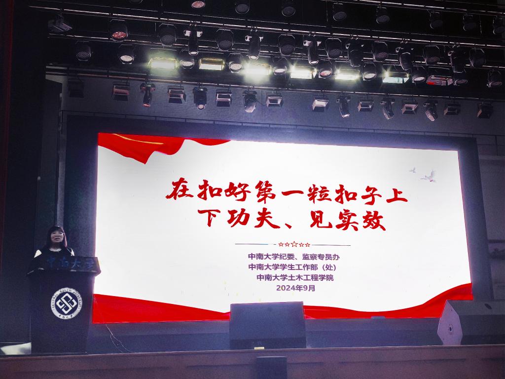 学院党委副书记纪晓飞以《在扣好第一粒扣子上下功夫、见实效》为题作“一个不能少”2024级新生廉洁教育宣讲。她从坚定理想信念,扣正“第一粒扣子”、严守纪律规矩,扣牢“第一粒扣子”、用于担当奋斗,扣好“第一粒扣子”三个方面进行讲述。她强调,全体研究生务必严守纪律规矩,勇于担当奋斗,扣正扣牢扣好“第一粒扣子”,以广大优秀中南校友为榜样,融入中南大学,实现人生理想。