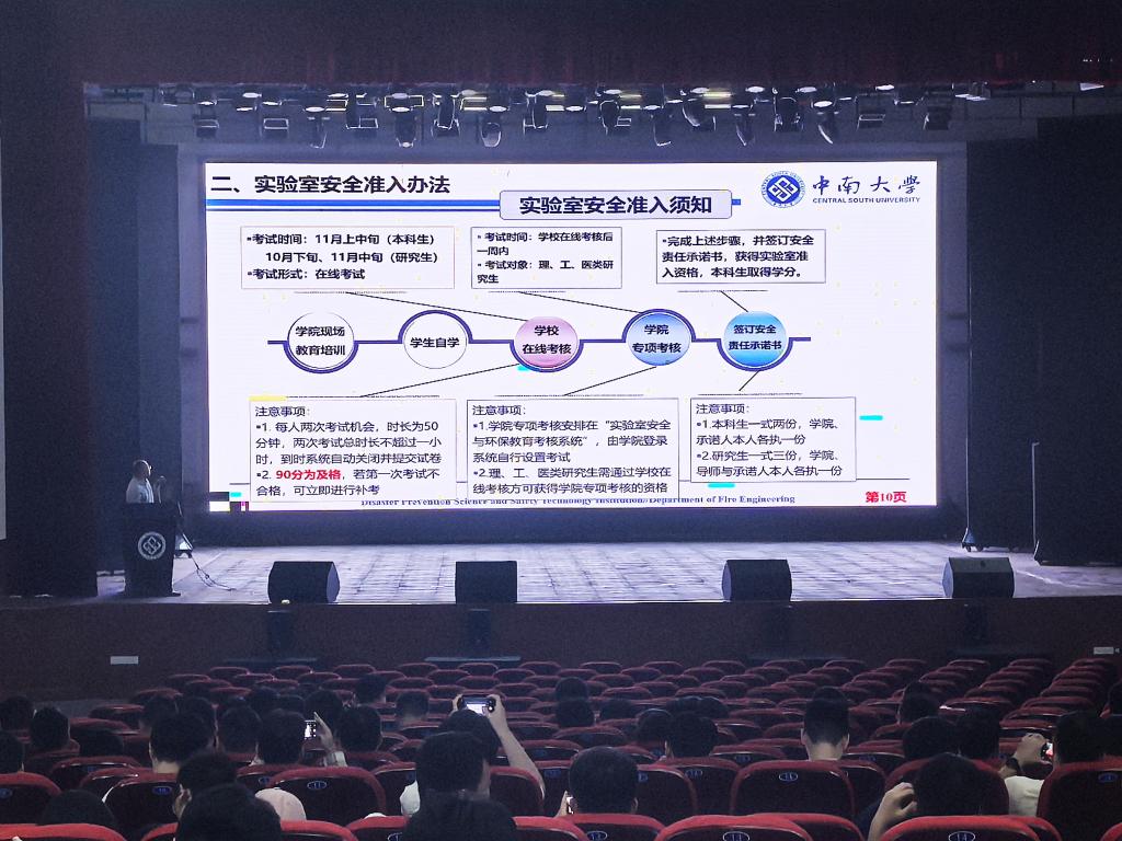 中南大学消防工程系颜龙老师为新生讲授《中南大学实验室管理制度和安全知识》,颜龙老师在授课中从实验室安全的重要性、实验室安全准入办法和高校实验室安全因素以及实验室安全环保基础知识等方面进行了细致系统的讲解,通过高校实验室事故案例深刻说明了保障实验室安全的重要性。
