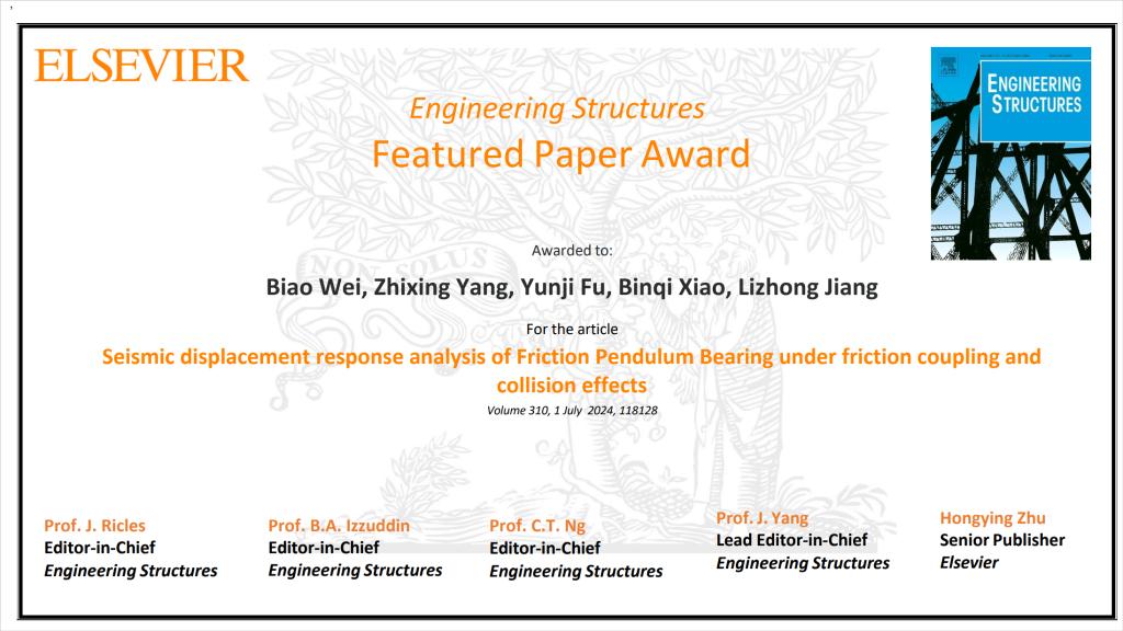 近日,土木工程领域权威期刊《Engineering Structures》编辑部公布了该期刊最佳论文奖(Featured Paper Award)遴选结果。由中南大学土木工程学院和高速铁路建造技术国家工程研究中心的魏标教授、蒋丽忠教授、杨智星硕士生、肖斌琦博士生和英国曼彻斯特大学的符云集博士生(魏标教授的硕士毕业生)合作完成的发表于该期刊2024年第310卷的论文“Seismic displacement response analysis of friction pendulum bearing under friction coupling and collision effects”荣获该奖。这是中南大学国产又黄又猛又粗又爽和高速铁路建造技术国家工程研究中心师生近年来首次荣获该奖项。