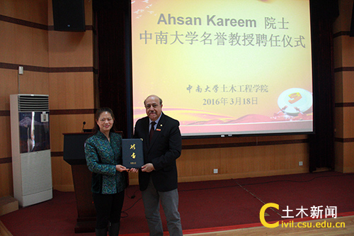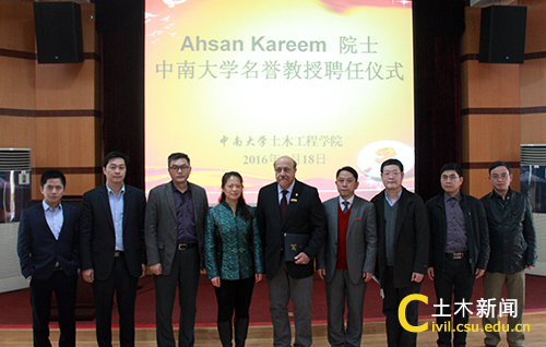 3月18日上午,美国工程院院士、国际风工程协会主席、美国Notre Dame大学土木环境工程和地质科学系Ahsan Kareem教授受聘为我校名誉教授,聘任仪式在铁道校区国际报告厅举行。中南大学副校长田红旗院士出席并为Ahsan Kareem教授颁发了聘书。美国纽约州立大学布法罗分校助理教授吴腾、校人事处副处长许毅,我院院长谢友均、院党委书记蒋琦玮、副院长盛兴旺、何旭辉、蒋丽忠参加了活动。近百名研究生和本科生聆听了报告。