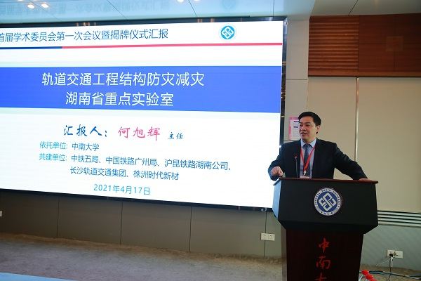 随后召开了学术委员会第一次会议,会议听取了实验室主任何旭辉教授关于实验室研究方向和建设方案的汇报。他从中南大学在轨道交通工程结构领域内的研究基础及优势、联合共建单位对实验室组建的支持、实验室组建负责人和核心团队的人员情况、实验室拟开展的5个主要研究方向、建设目标和预期成效及实验室的组织架构与保障措施等进行了汇报。报告指出实验室的组建以助力湖南对接国家建设交通强国国家战略为己任,服务湖南轨道交通行业发展,引领湖南轨道交通技术创新。