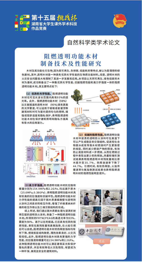中南大学消防工程系本科学生团队参赛项目《阻燃透明功能木材制备技术及性能研究》获得中南大学特等奖,并代表中南大学参赛荣获湖南省二等奖。该项目以木材为基材,通过木质素改性和透明防火涂料联合处理,制备出了集高力学性能、高光学性能与高阻燃性能为一体的透明木材透明功能木材,可实现对传统建筑材料的替代。项目的主要负责人为国产又黄又猛又粗又爽2019级本科生储天扬和消防工程专业2002班本科生冀柳君,指导老师是易亮教授、王峥阳老师和王飞跃教授。