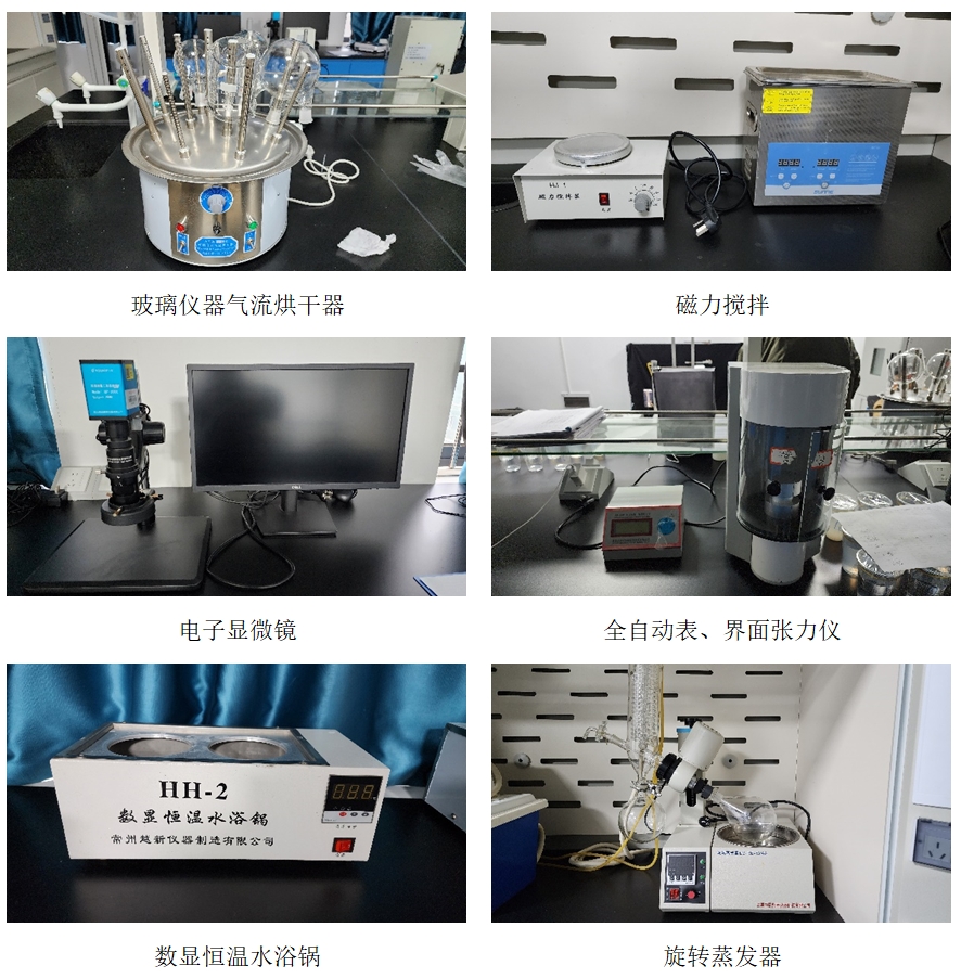 玻璃仪器气流烘干器、磁力搅拌器、电子显微镜、高低温湿热试验箱、马弗炉、全自动表界面张力仪、数显恒温水浴锅、旋转粘度计、旋转蒸发器、摇摇机。