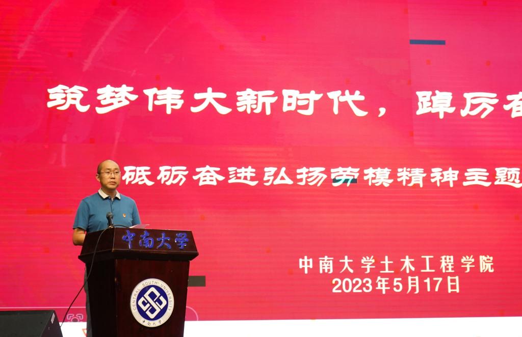 杨鹰副书记对本次系列报告作了简要介绍,指出在全院学习贯彻习近平新时代中国特色社会主义思想主题教育开展之际,举行“砥砺奋进,弘扬劳模精神”主题教育系列报告,旨在教育引导土木学院师生,经受思想淬炼、精神洗礼,以“爱岗敬业、争创一流、艰苦奋斗、勇于创新、淡泊名利、甘于奉献”的劳模精神筑牢信仰之基、补足精神之钙、把稳思想之舵。