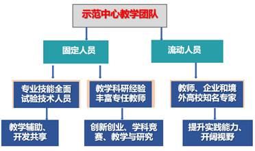 示范中心现有固定人员96人,流动人员57人,人员的能力和年龄结构合理。固定人员中专任教师80人,实验技术人员16人。专任教师中教授53人,副教授20人,教学和科研经验丰富职称合理。示范中心教学团队采用了实验教学与理论教学互通,校内师资与校外师资流动结合的方式。专任教师和实验技术人员共同承担实验教学工作,满足示范中心开放共享、学生创新创业训练项目、探索性实验研究及学科竞赛要求。流动人员由企业和境外高校专家组成,通过校企合作提升学生实践能力,专家讲座交流扩大学生视野。