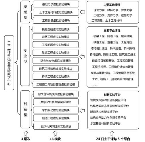 中心本着“虚实结合、相互补充、能实不虚”的总体原则,以土木工程为基础、以铁路为特色、以培养学生创新意识创新能力为宗旨,立足科研反哺教学的工作思路,将实验教学与科学研究、工程实践相结合,建立了“基础型、专业型、创新型”3个层次,16个实验模块、61个实验项目的土木工程虚拟仿真实验教学资源体系,如图1所示。
