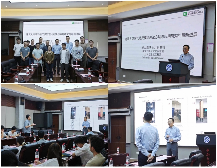 2023年10 月18 日上午,加拿大舍布鲁克大学土木与建筑工程系戚大海副教授于中南大学铁道校区世纪楼14楼会议室作汇报,戚大海副教授汇报的主题为建筑火灾烟气缩尺模型理论方法与应用研究的最新进展。他首先介绍了一种全新的高层建筑火灾烟气流动缩尺模型,通过考虑火灾烟气与边界之间的热交换,提出准确性更高的弗劳德-斯坦顿建模方法。其次,戚大海副教授还提出了太阳能电板火灾烟气流动缩尺模型,以及一种新的氦相似理论和太阳能电板火灾烟气扩散风洞试验的标度方法,并介绍了建筑一体化光伏双层幕墙火灾烟气扩散机理,提出了一种经济、安全、实用的模拟方法。汇报结束后,与会师生与戚大海副教授展开交流。部分师生结合自己的实验课题和科研经历向戚大海副教授提出疑问,戚大海副教授均细致回答,与师生互通有无。