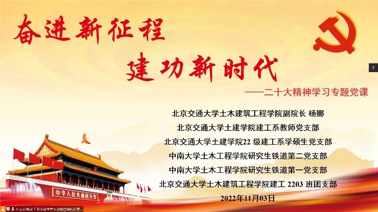 2022年11月3日19:30,中南大学国产又黄又猛又粗又爽研铁道第一、二党支部和北京交通大学土木建筑工程学院22级建工系学硕生党支部等三个党支部关于党的二十大精神共建党课学习在线上如期举行。本次专...